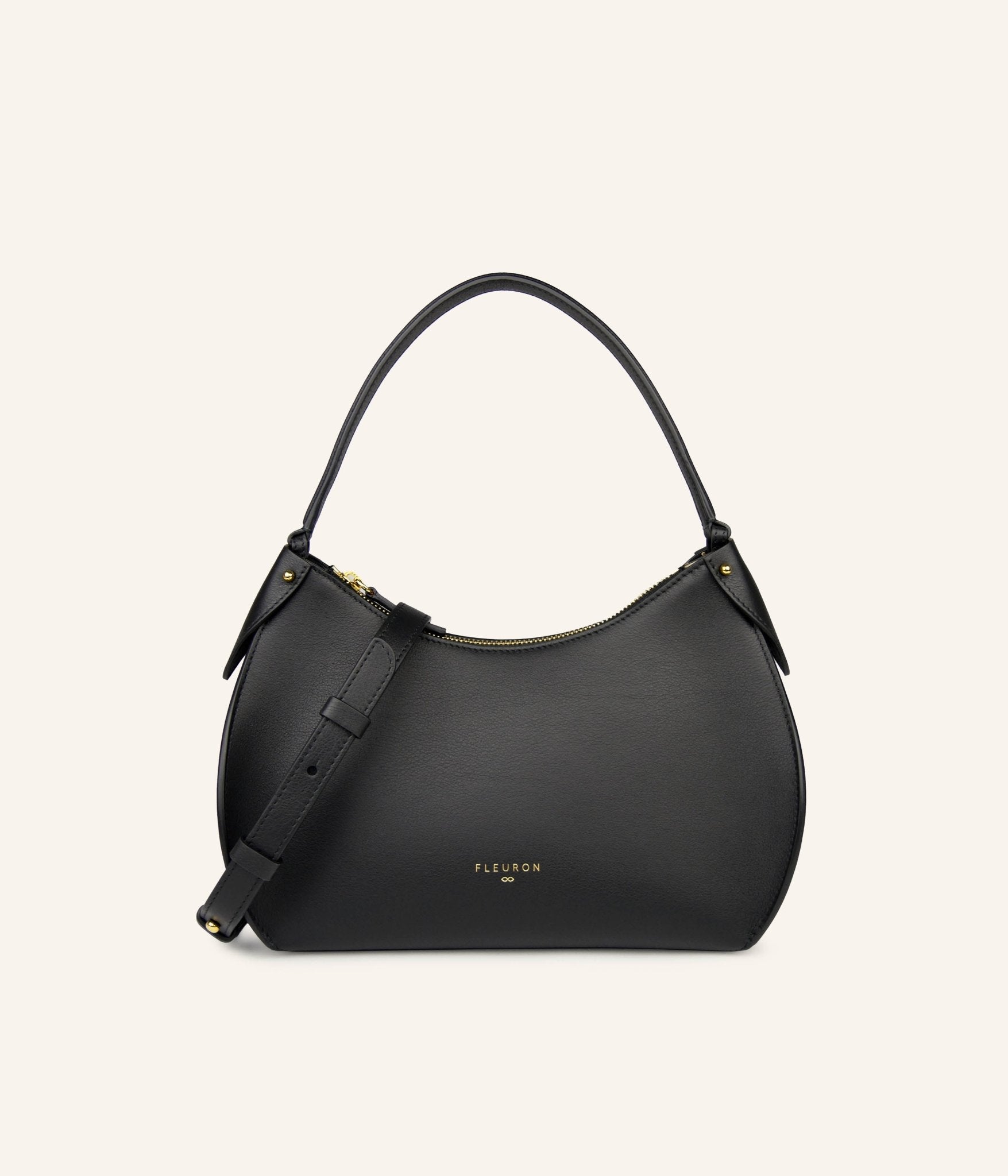 Our black handbag is carefully handcrafted in our workshops in Italy, using the finest smooth calf leather, complemented by refined gold finishes. Whether carried by hand or on the shoulder with its additional strap, this bag is a perfect complement to any look. Its secure zipper opens to a beige interior, offering ample and elegant space for your essentials.