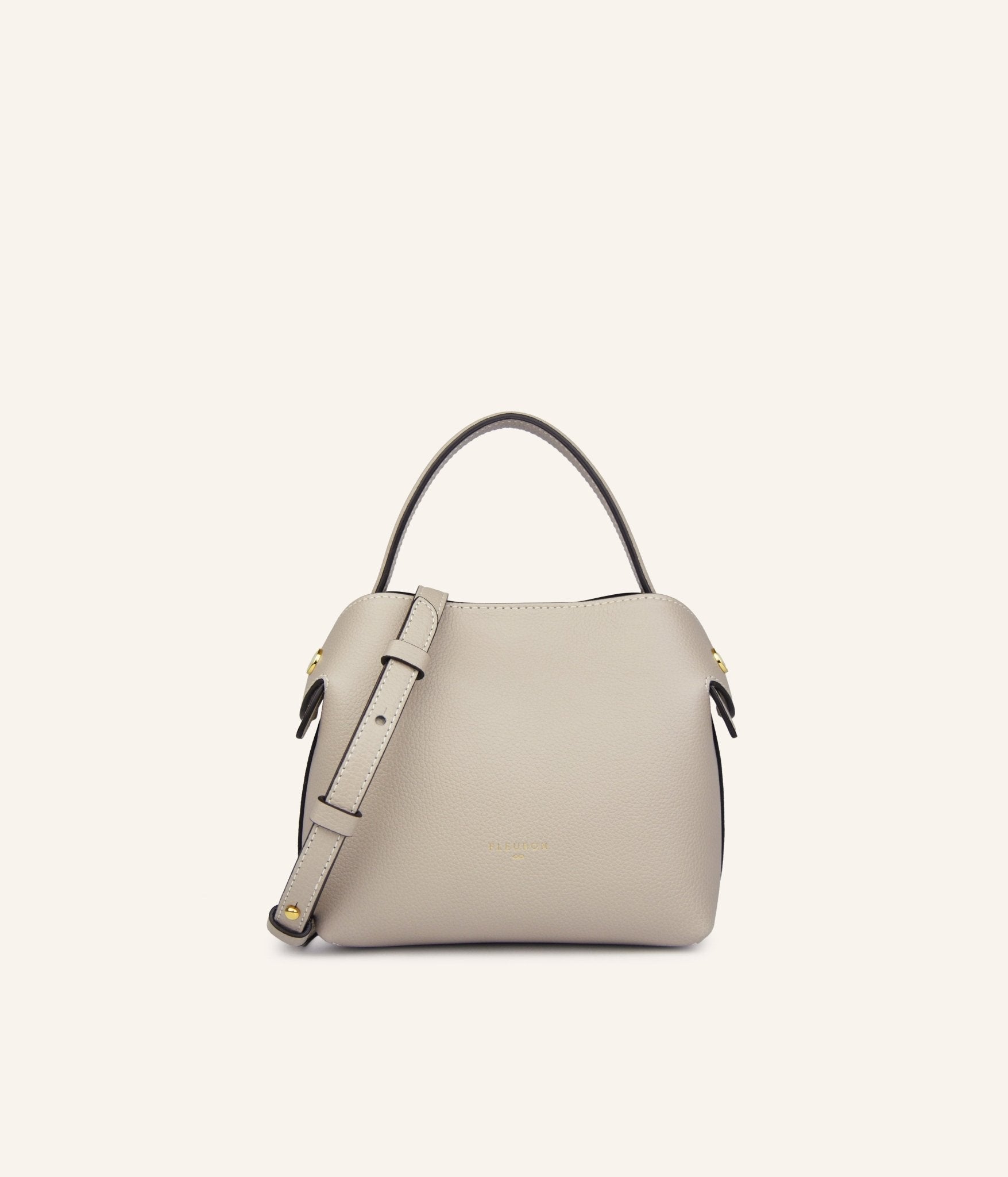 Handcrafted in our Italian atelier from grained calfskin and finished with gold-tone details, the Mini Swann Cashmere can be carried by hand, over the shoulder, or crossbody. It closes with an automatic magnetic clasp and opens to a bright beige interior. Its sides, fitted with magnetic folds, gently open to let the removable strap pass over the top for shoulder or crossbody wear, or fall gracefully when carried by hand.