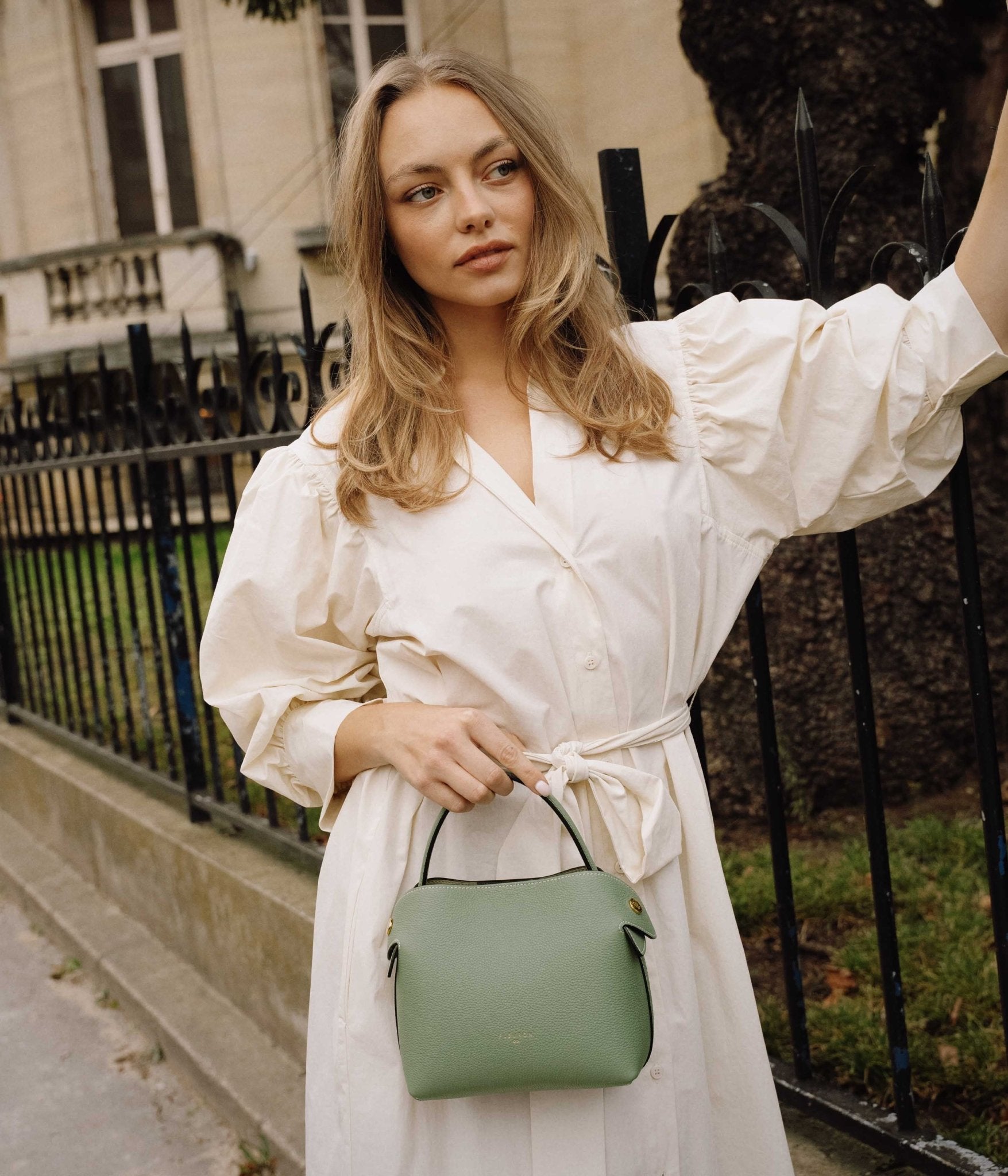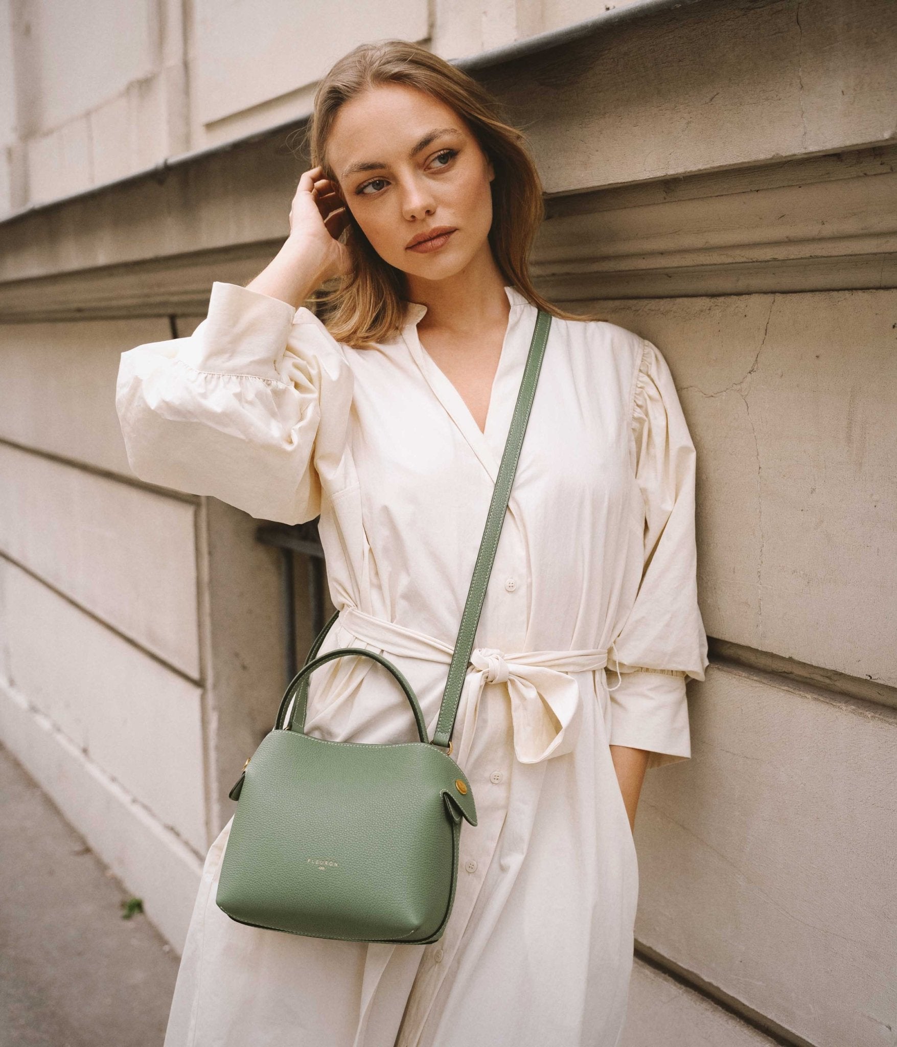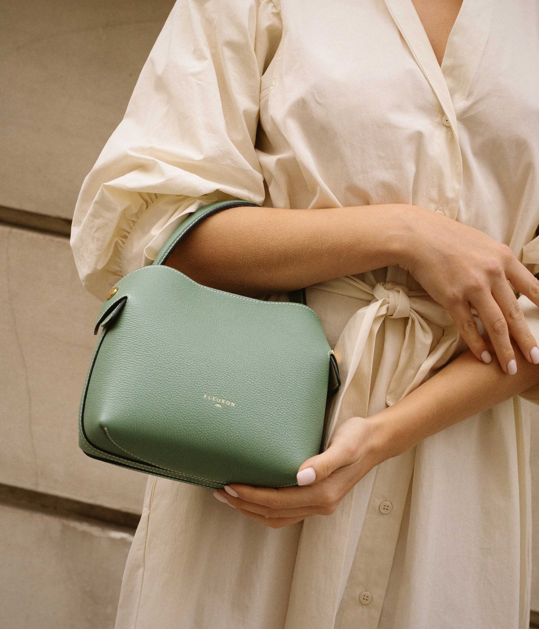 A supple silhouette, an elegant touch with its top handle, the sides fold and unfold like the beating of a wing, for an airy look. The Swann, available in a mini format, has an elongated shoulder strap that leaves your hands free. Be in harmony with nature with our Fleuron bag in almond green color. This soft and relaxing shade is perfect for those looking to add a touch of tranquility to their wardrobe. Made in Italy with grained calf leather, this bag features a beige interior and golden details.