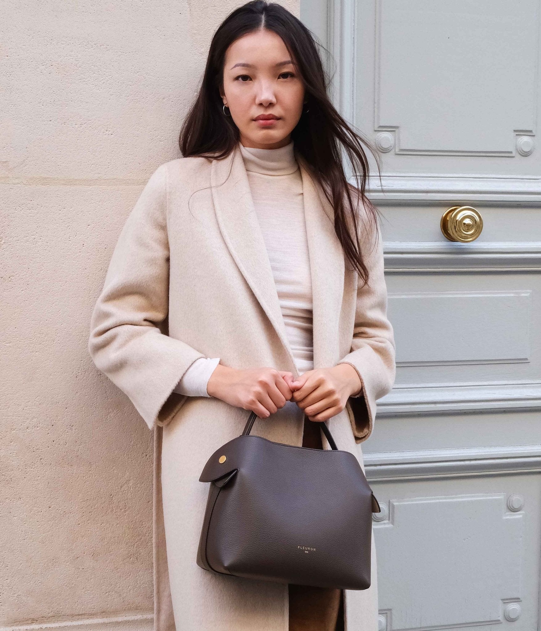 Handcrafted in our Italian workshop from grained calf leather and finished with gold-tone details, the Swann can be carried by hand, worn over the shoulder, or as a crossbody. It closes with a magnetic snap over a beige interior. The sides open with hidden magnets, allowing the detachable strap to pass over the top for shoulder wear, or hang freely when carried by hand.