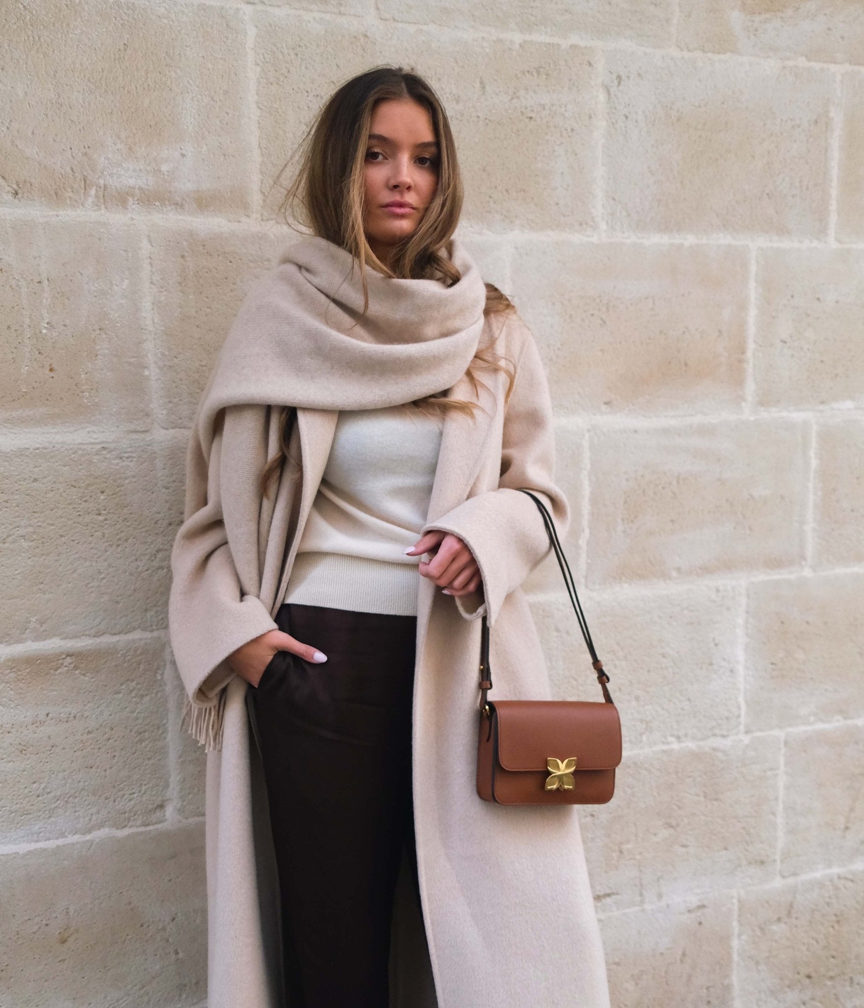 Its rich, enveloping Marron tone pairs beautifully with soft shades like ivory, sandy beige, or blush pink, creating a balanced and luminous look. For a bolder silhouette, it also complements deeper hues such as navy blue, forest green, or burgundy, which highlight the depth of its color.