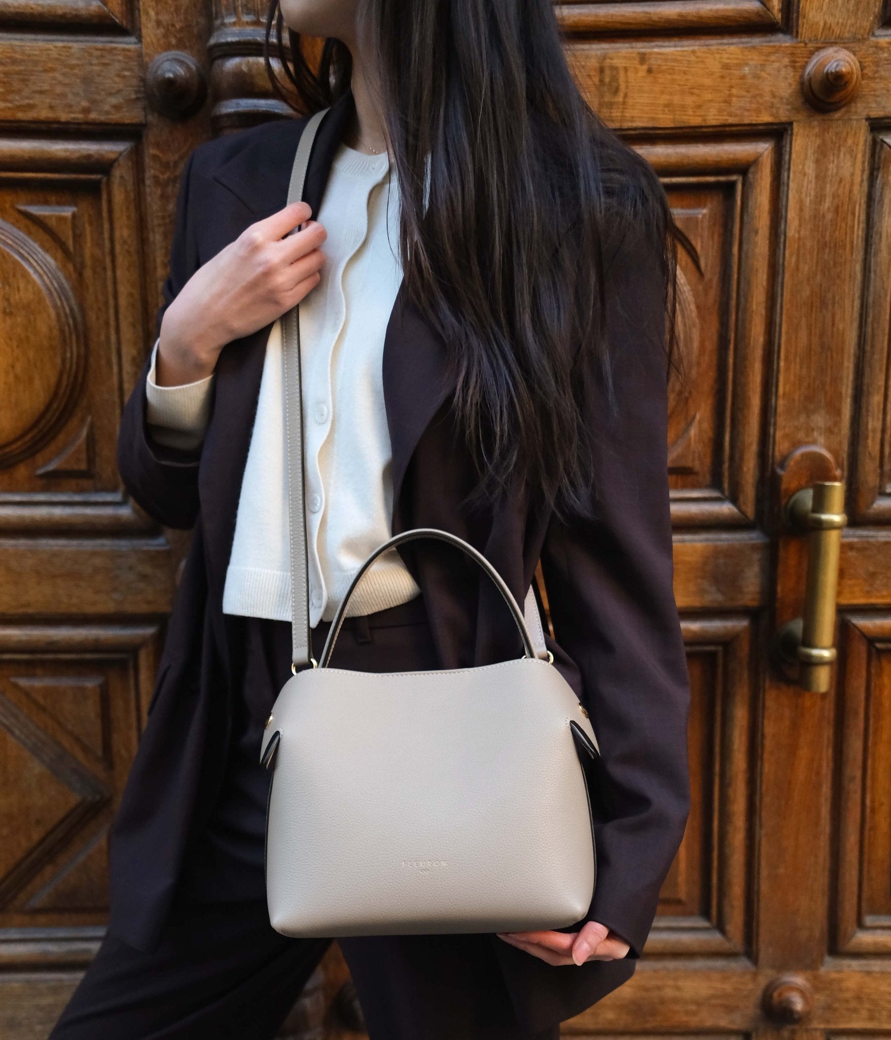 The Medium Swann in Cashmere grained calfskin captivates with its soft, enveloping shade, offering understated elegance in a more generous format. Subtle and refined, this color adapts effortlessly to every silhouette and transitions naturally through the seasons.