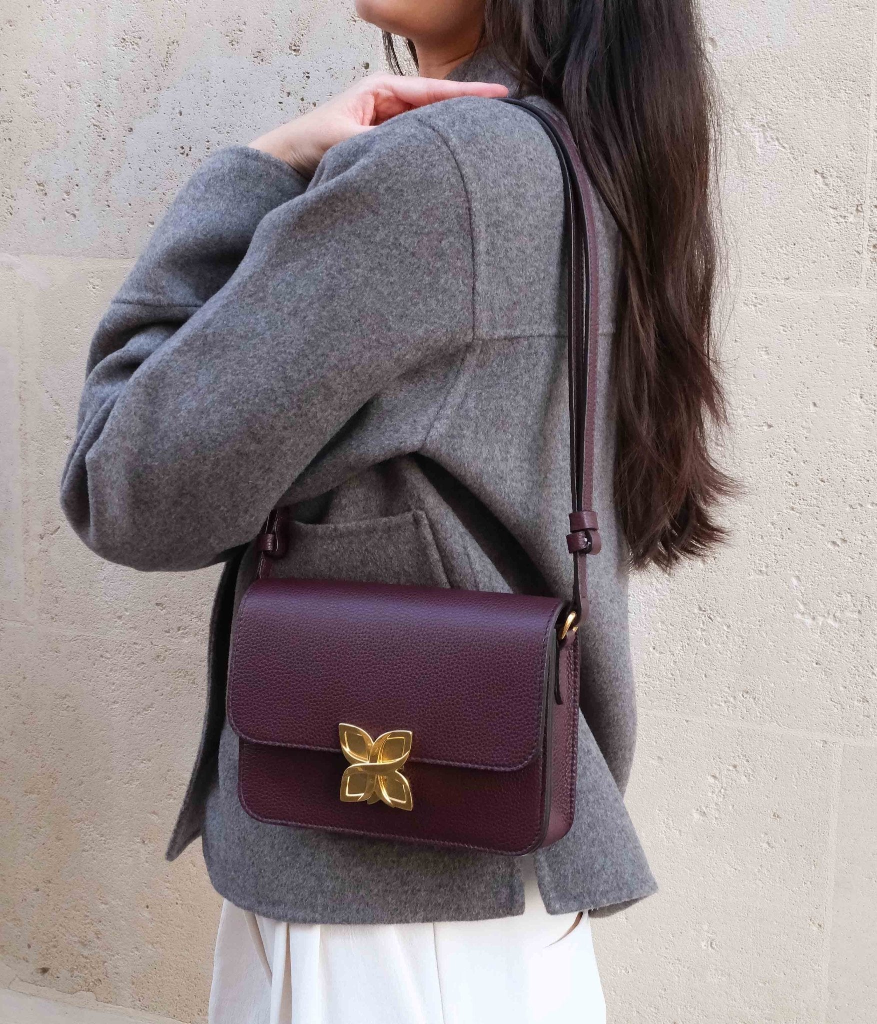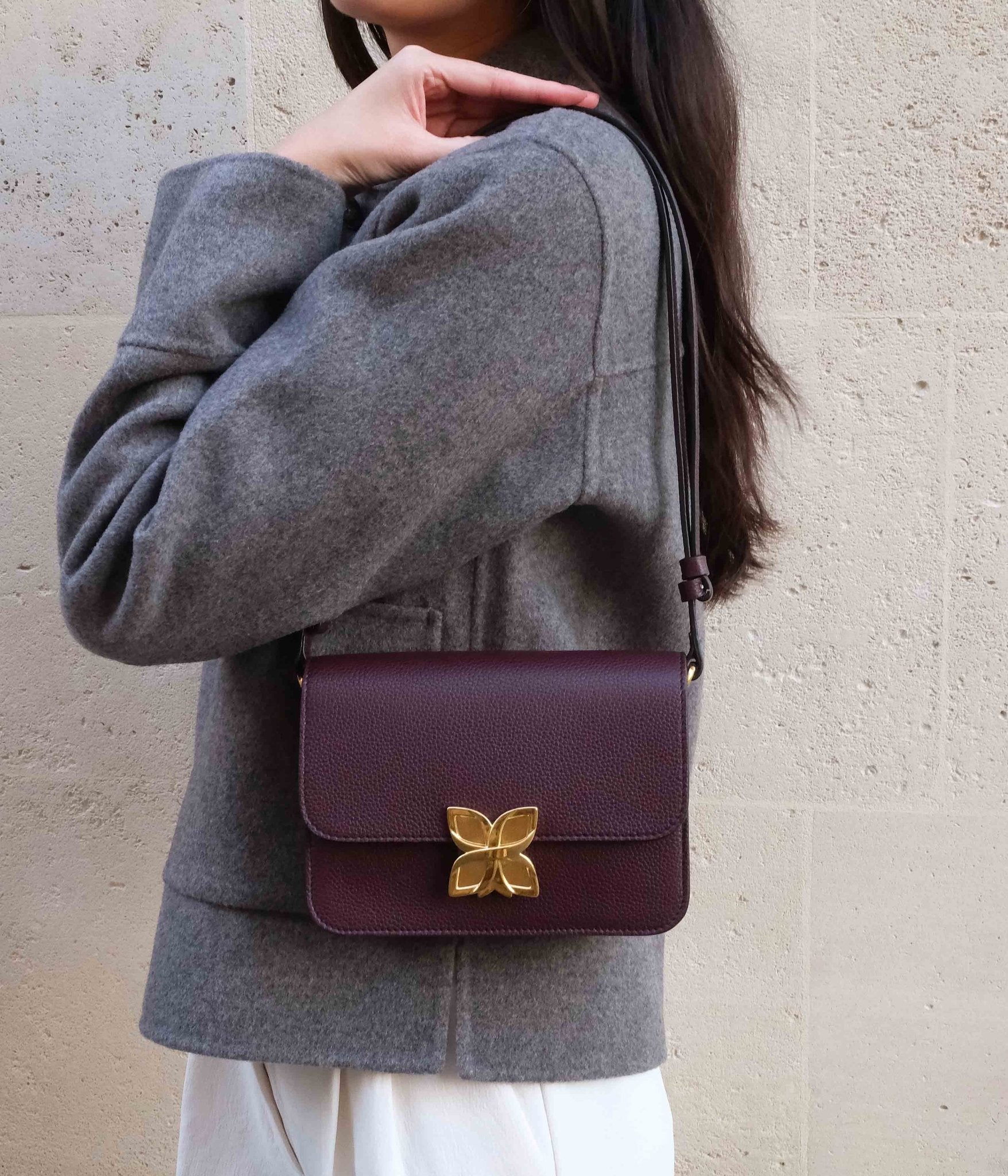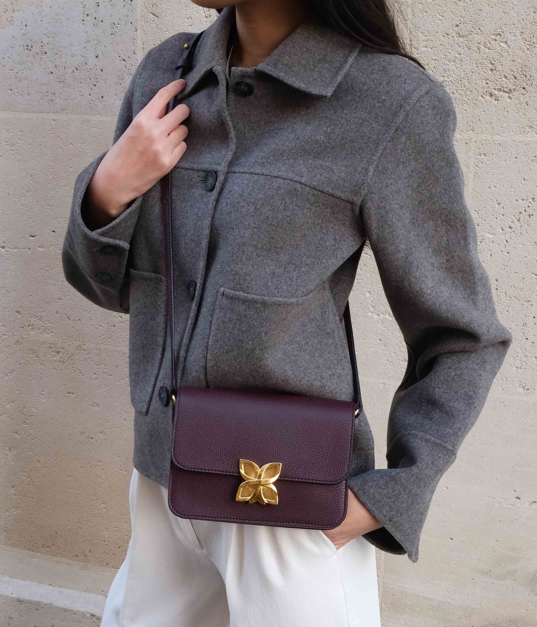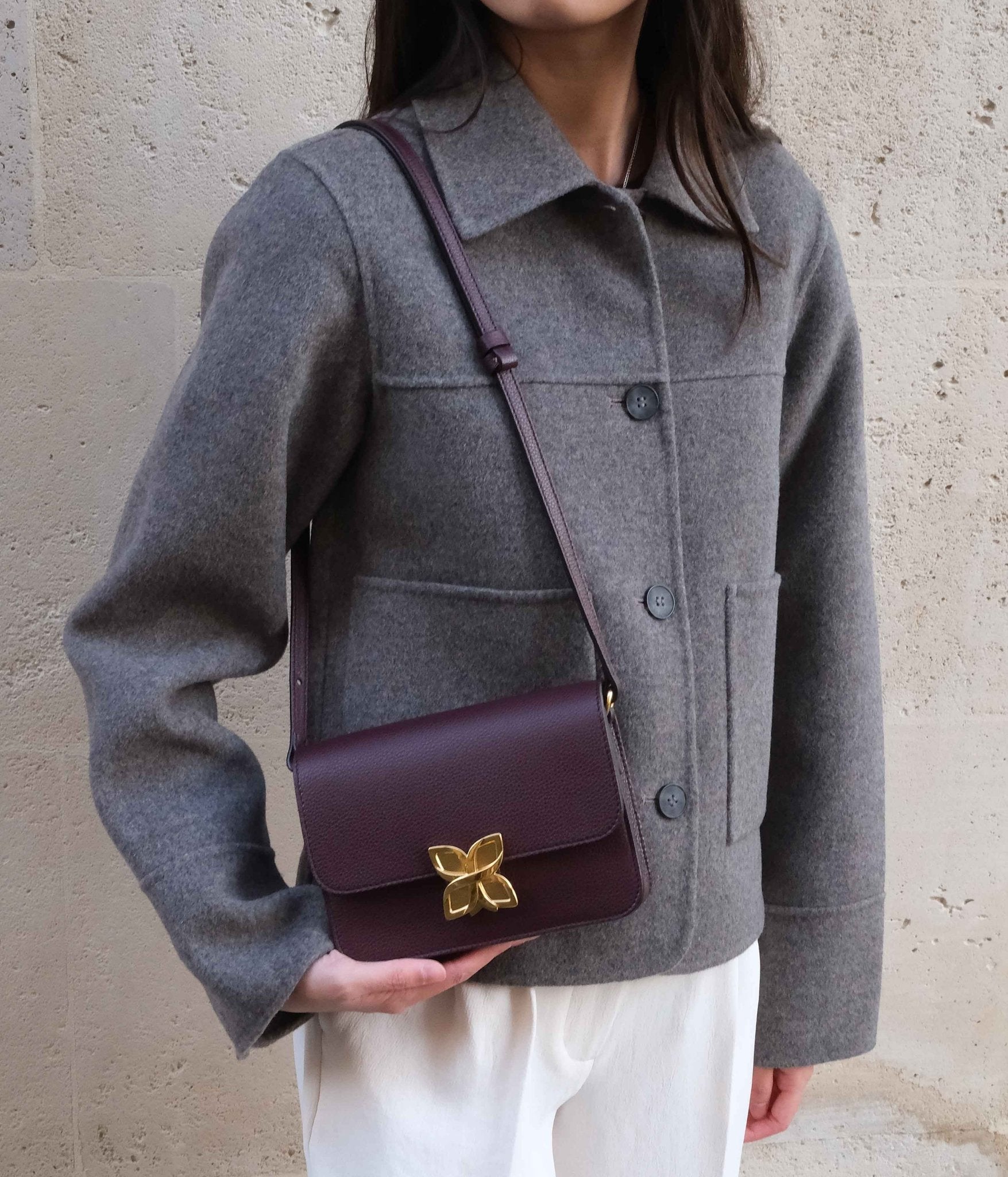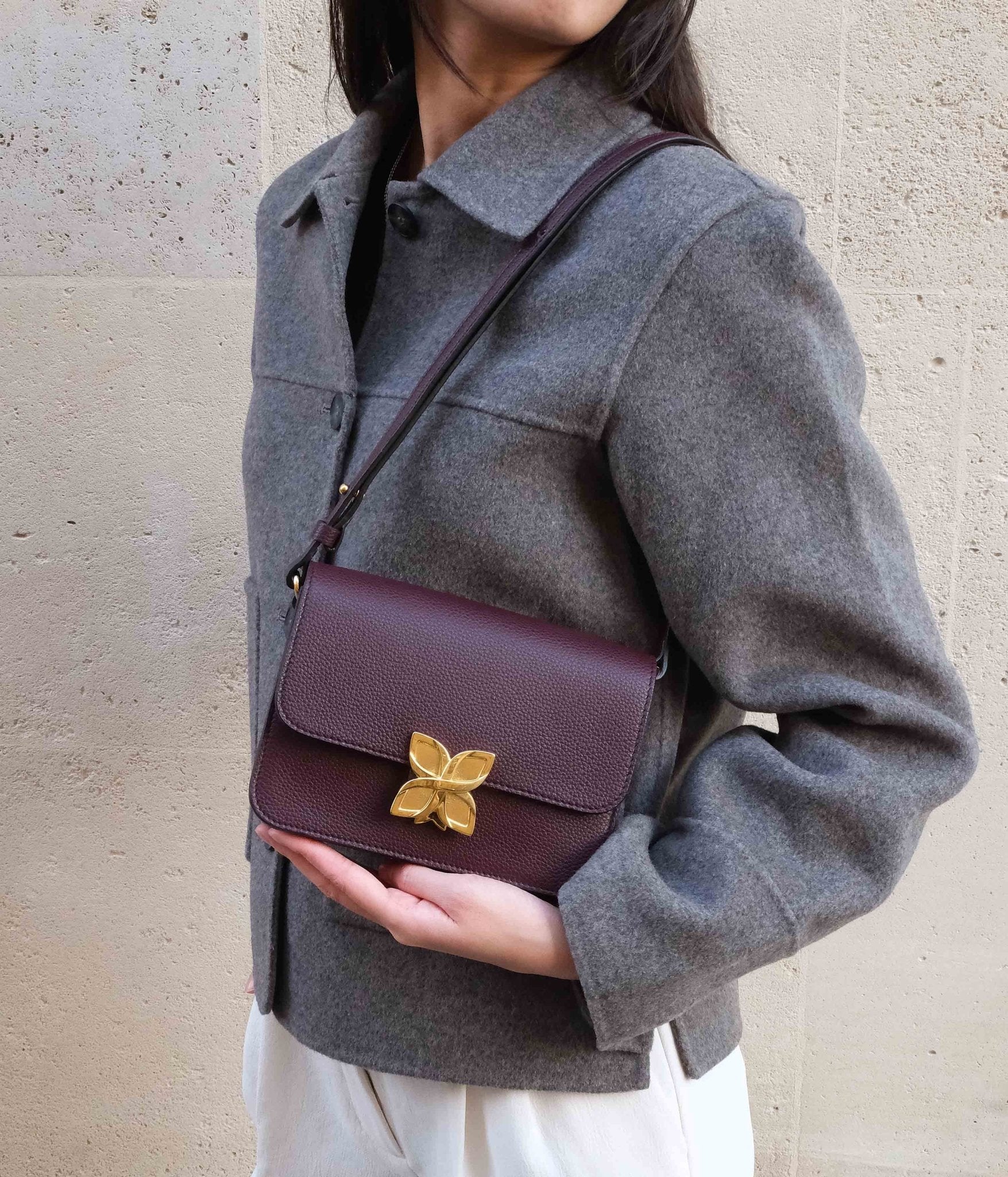 Discover the deep elegance of the Mini Hortensia in Prune, wrapped in finely grained calf leather that captures the richness of this mysterious and refined shade. Carefully handcrafted in our Italian workshop, this accessory reflects exceptional craftsmanship and meticulous attention to every detail.