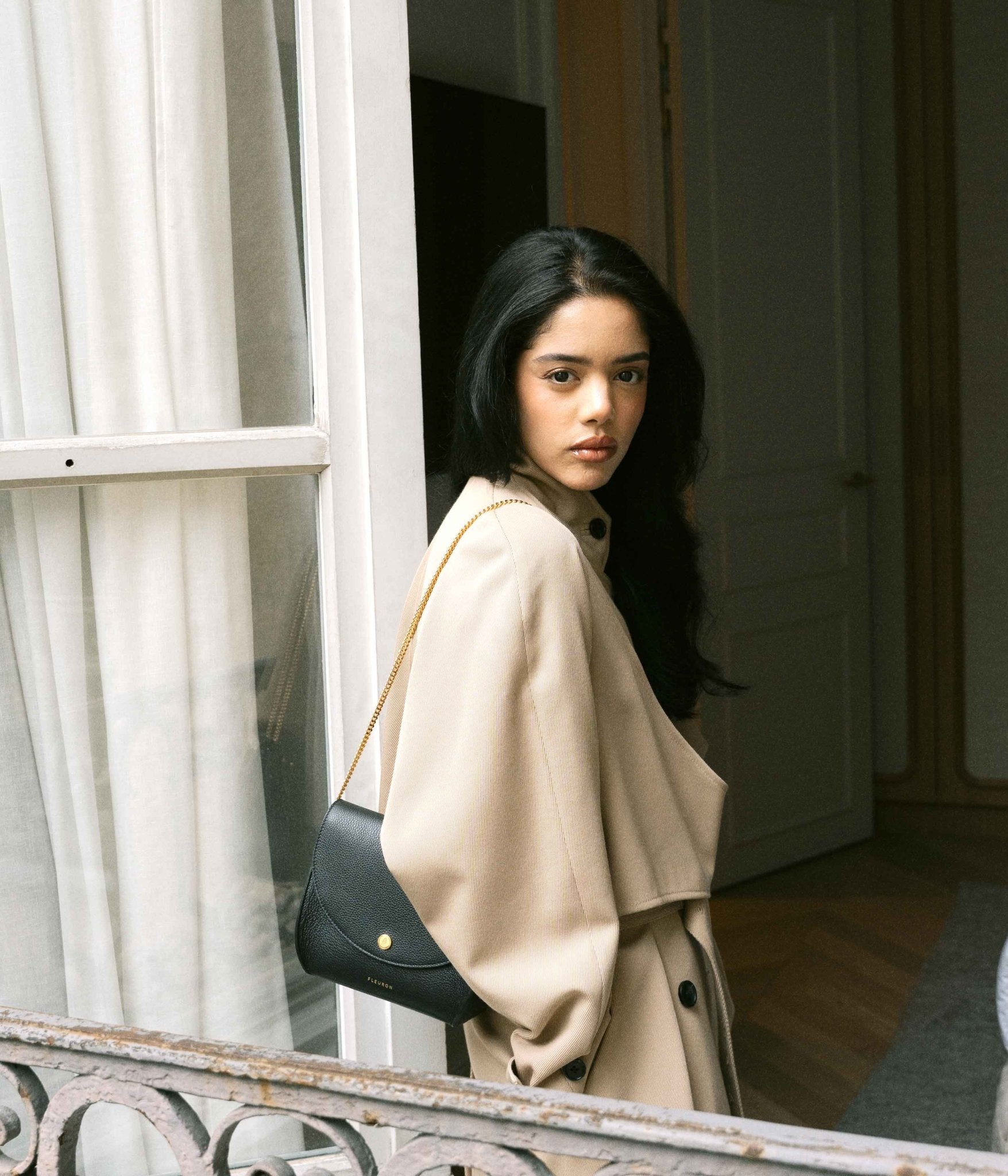 Made from carefully selected grained calf leather, it features a refined texture and impeccable structure. Discreet gold-tone finishes bring a touch of light to its deep, timeless black. This versatile hue pairs seamlessly with a wide range of tones—from off-white to charcoal grey for a sleek monochrome look, or with bolder shades like garnet red, cobalt blue, or emerald green for a striking contrast.
