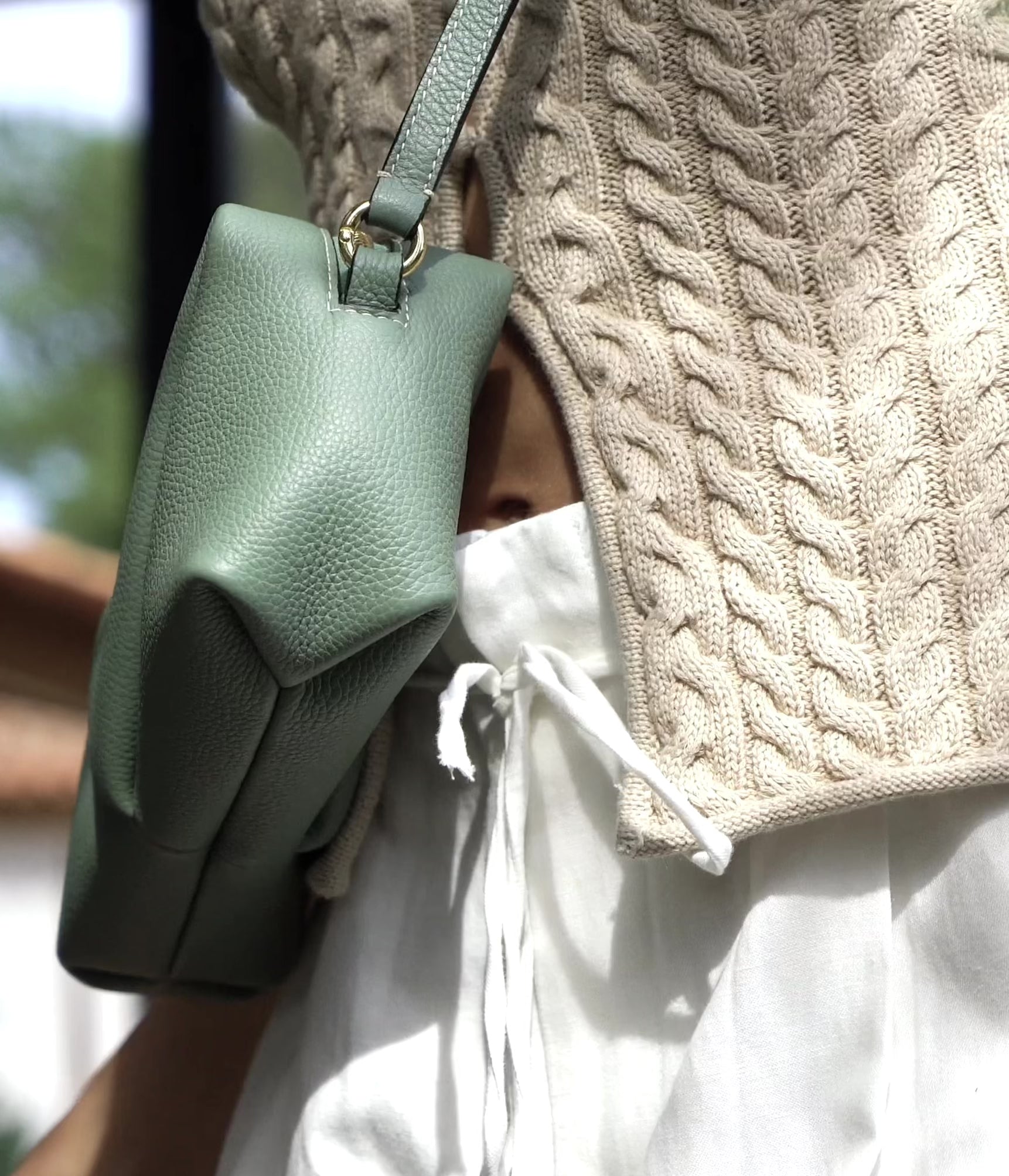 The Trinity shoulder bag by Fleuron in almond green adds a touch of modernity to your style. This soft and elegant color is a trendy choice that reflects your fashion sense. Handcrafted in Italy from calfskin, this shoulder bag offers various carrying options and provides enough space for your essentials. It closes with a zipper on a beige interior.
